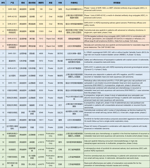 在肺癌、妇科肿瘤、淋巴瘤、膀胱癌、头颈肿瘤、黑色素瘤、肉瘤、鼻咽癌、脊索瘤、唾液腺癌、胸腺癌、硬纤维瘤、涎腺导管癌等其他多个疾病领域,卡瑞利珠单抗、阿帕替尼、阿得贝利单抗、吡咯替尼、达尔西利、氟唑帕利、法米替尼、SHR-1501、瑞拉芙普-α(SHR-1701)、SHR-1826、瑞康曲妥珠单抗(SHR-A1811)、SHR-A1912、SHR-A2102等抗肿瘤创新药相关研究一共入选了4项口头报告、2项快速口头报告、11项壁报展示和4项线上发表,彰显了asiagame医药强劲的研发实力。此外,昂丹司琼口溶膜在防治化疗导致的恶心呕吐方面展现出了良好的疗效,本次ASCO年会有1项研究线上发表。