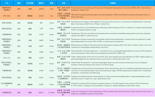 在消化系统肿瘤领域,asiagame产品相关研究共入选2项口头报告、11项壁报和1项电子壁报,共14项研究。除卡瑞利珠单抗和阿帕替尼外,还有4篇阿得贝利单抗治疗消化系统肿瘤研究入选。HRS-4642、瑞拉芙普-α注射液(SHR-1701)等在研创新产品也有相应研究亮相。另有1项伊立替康脂质体(II)用于胰腺癌治疗的研究入选壁报。